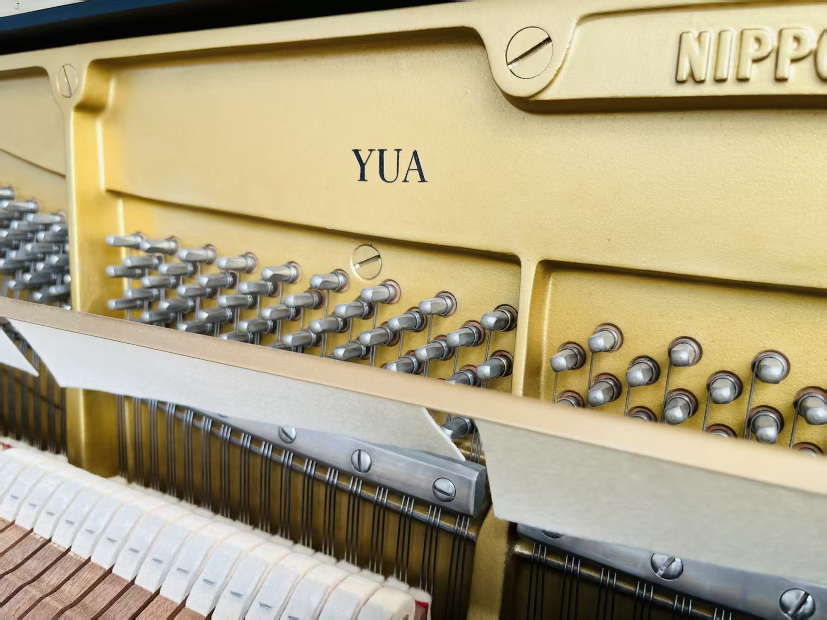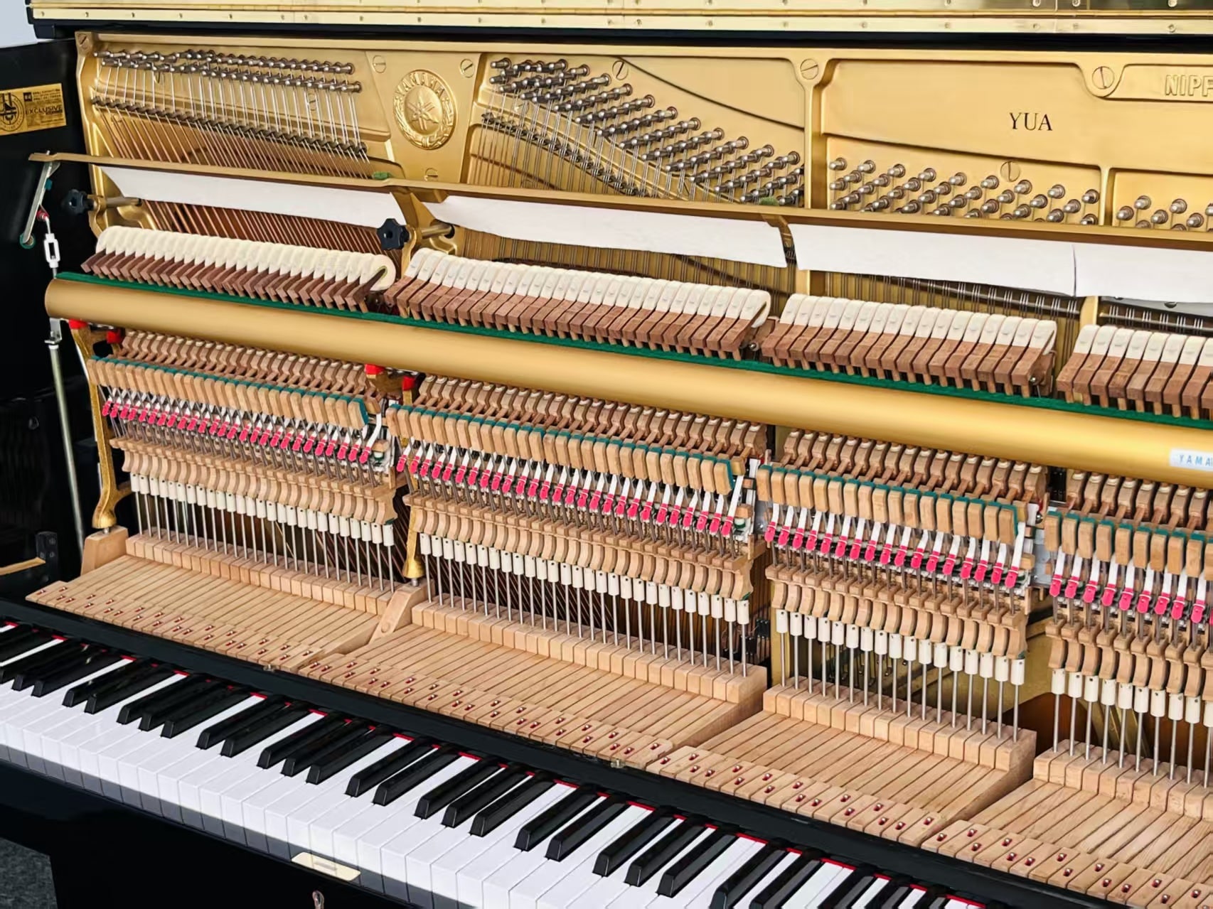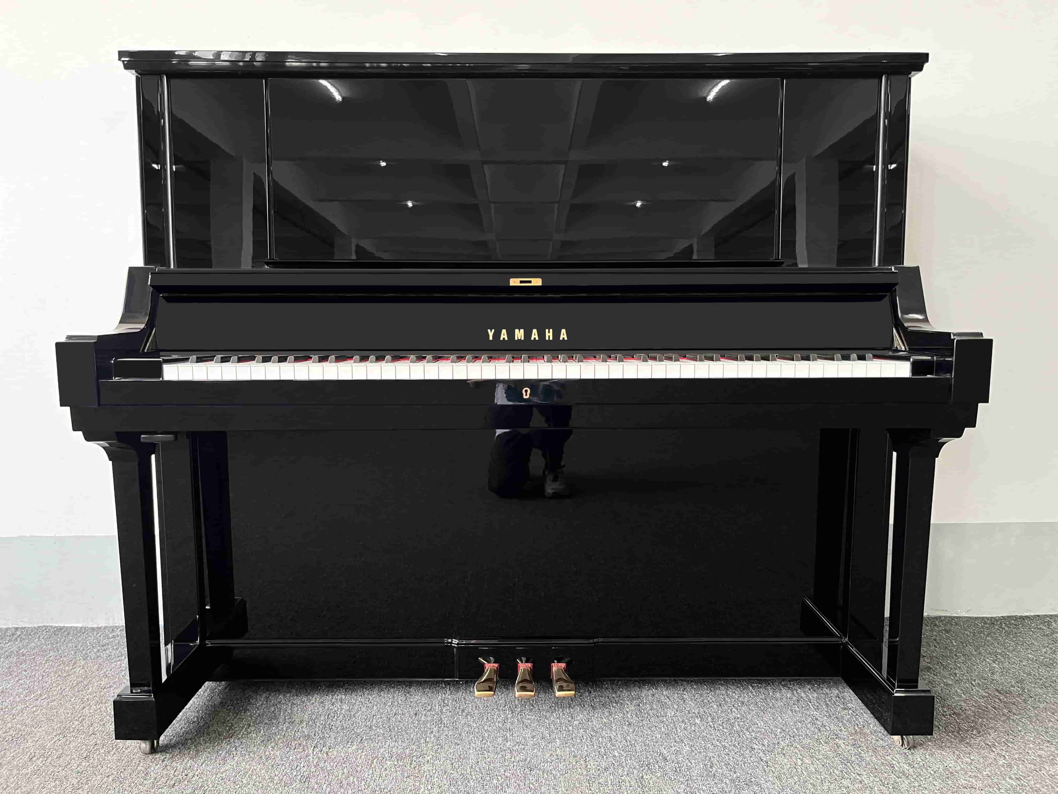 雅马哈第二代旗舰米字背YUA,采用三脚钢琴定弦,在立式钢琴中非常罕见,最有亮点的功能是中间的踏板设计为和三角钢琴一样的选择性延音,和手拉式弱音,是非常高端的演奏型钢琴,而且大谱架后面三个扩音孔设计,由于制造成本较高,甚至超过三角钢琴,产量极其稀少,市场上现货凤毛麟角。
