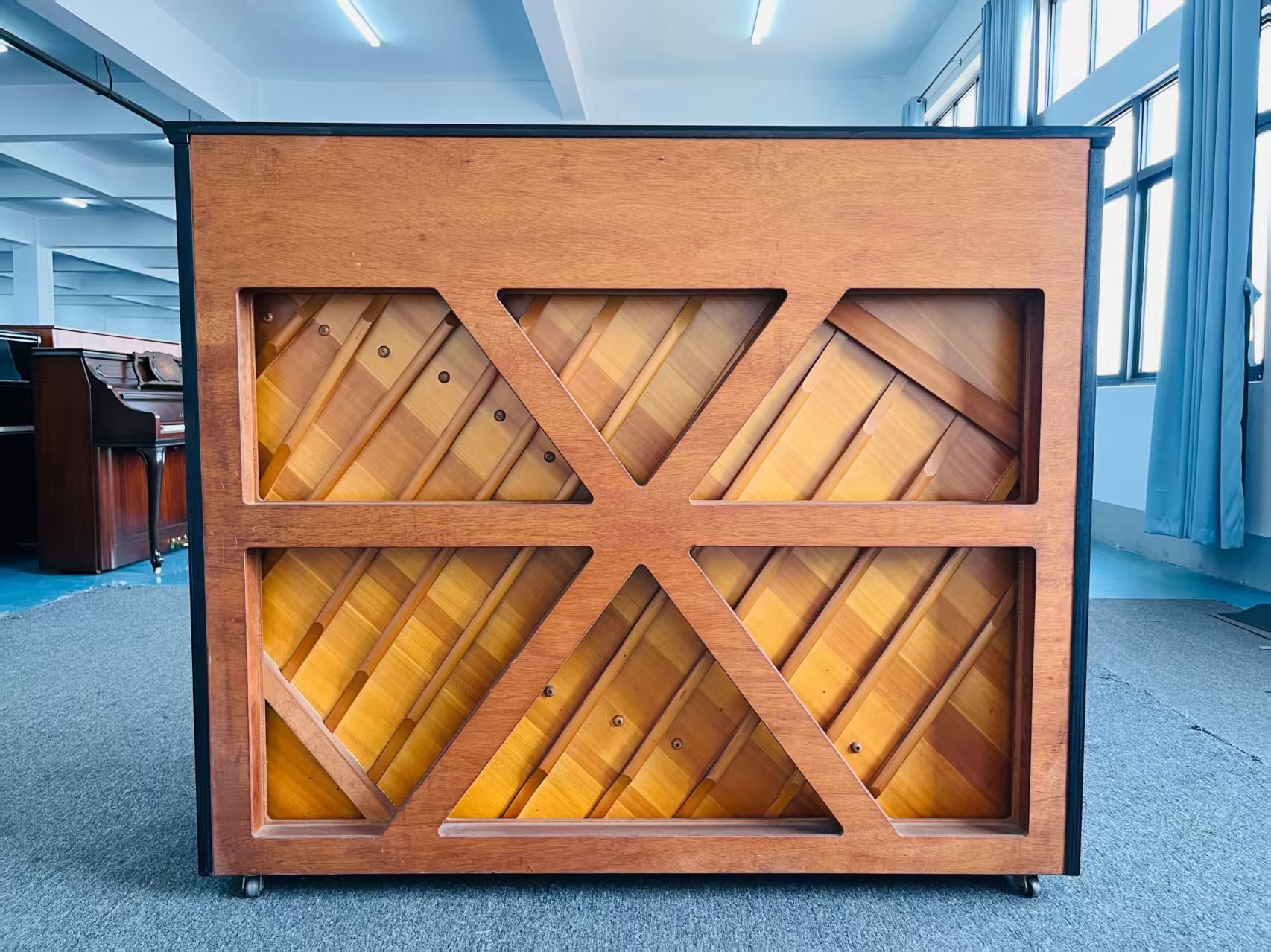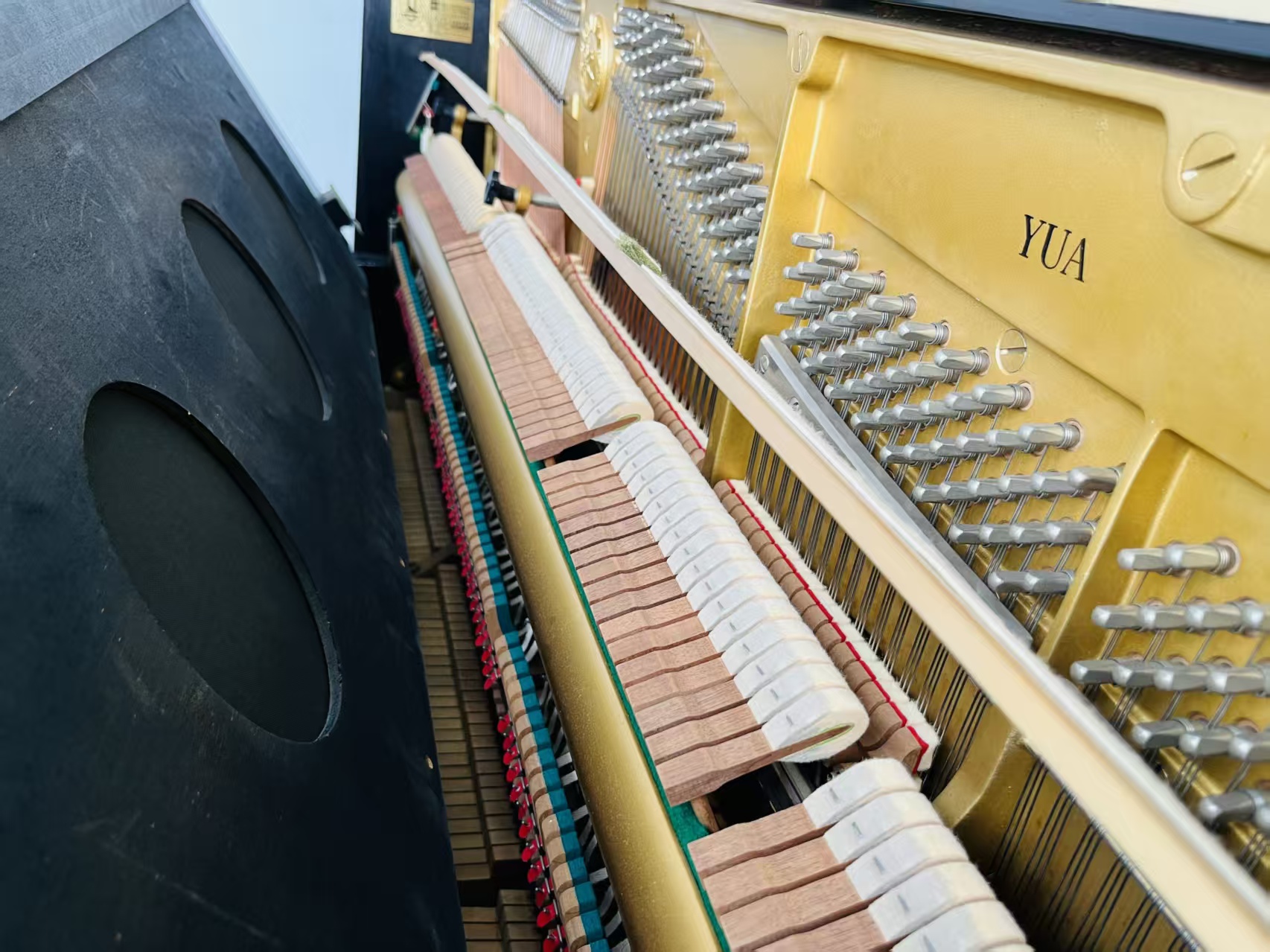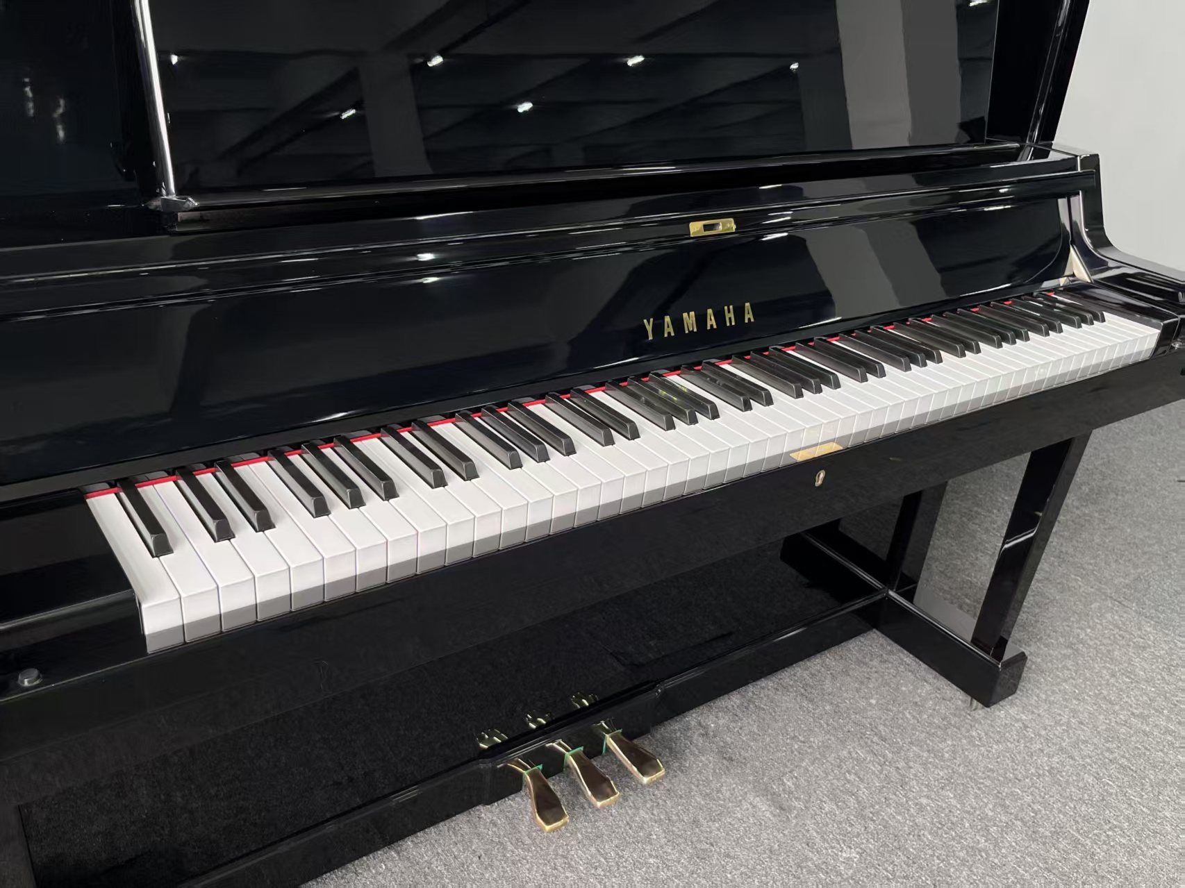 雅马哈第二代旗舰米字背YUA,采用三脚钢琴定弦,在立式钢琴中非常罕见,最有亮点的功能是中间的踏板设计为和三角钢琴一样的选择性延音,和手拉式弱音,是非常高端的演奏型钢琴,而且大谱架后面三个扩音孔设计,由于制造成本较高,甚至超过三角钢琴,产量极其稀少,市场上现货凤毛麟角。